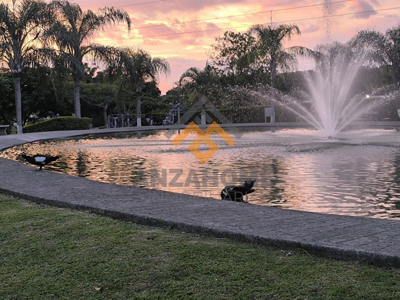 Lago con patos, tortugas y peces.