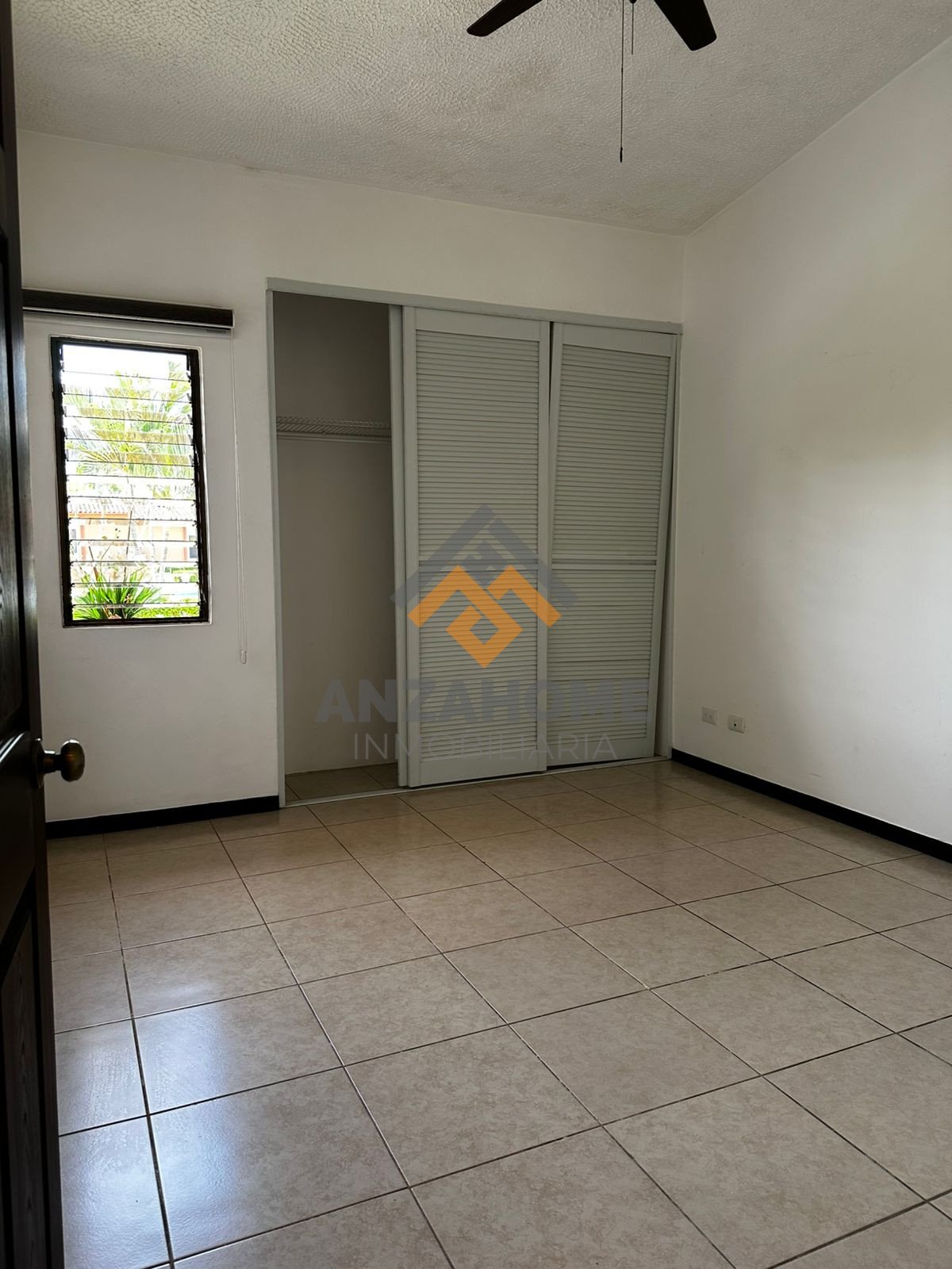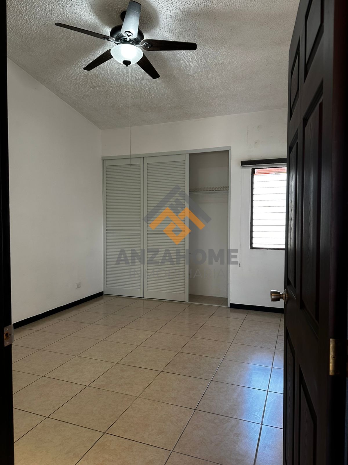 Dormitorio principal con abanico, baño completo y closet.